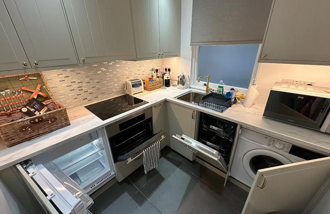 تم تجهيز المطبخ المجهز بالكامل بالمايكرويف والغلاية الكهربائية وثلاجة للخدمة الذاتية. يقع مكان الإقامة على بعد أمتار فقط عن The Pump Room ، وهو مكان لتناول الطعام. تقع الشقة بمساحة 100 مترًا مربعًا على بعد أقل من 5 دقائق سيرا من محطة حافلات Bath.